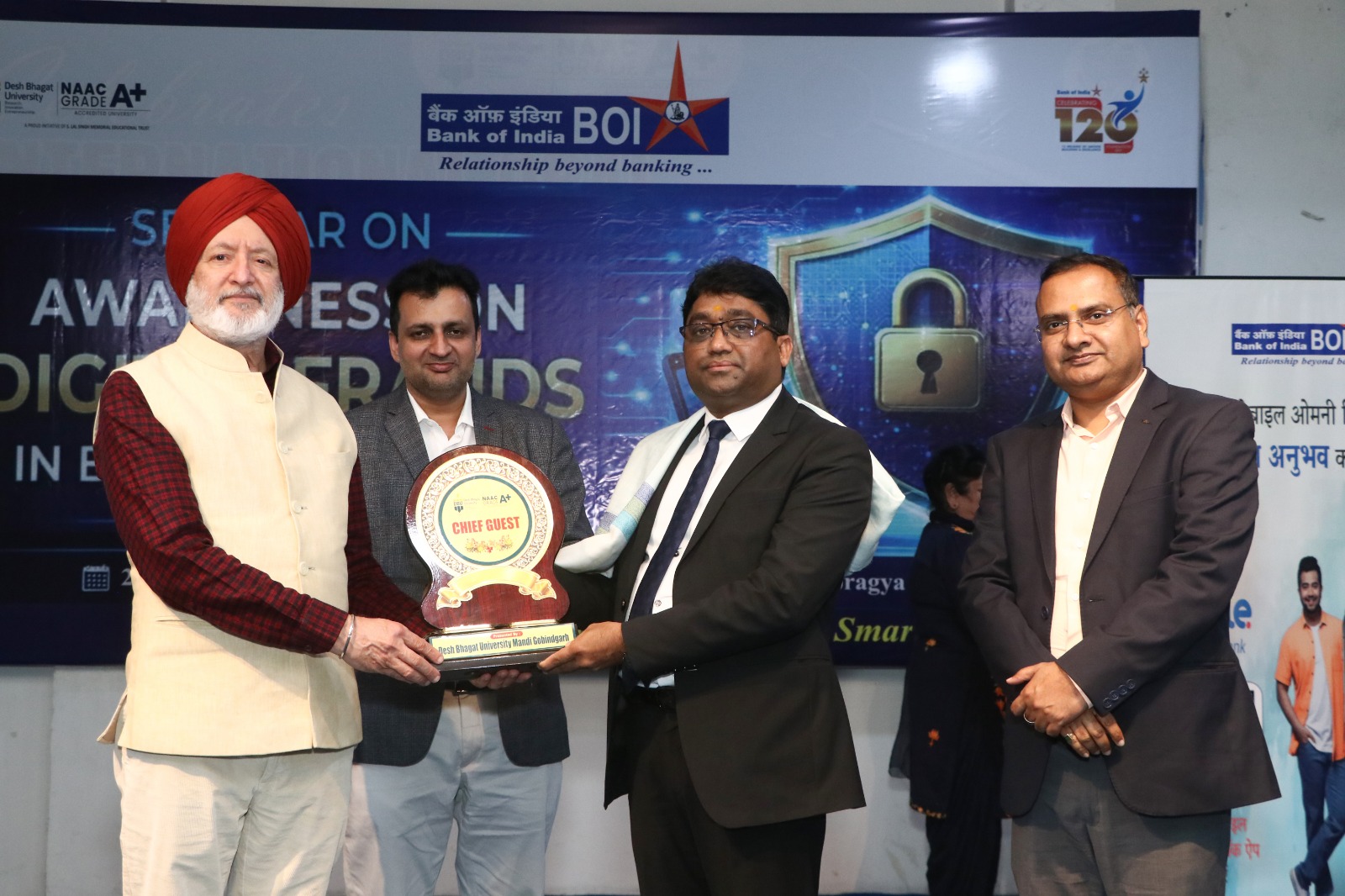 ਮੰਡੀ ਗੋਬਿੰਦਗੜ੍ਹ, 2 ਮਾਰਚ: ਦੇਸ਼ ਭਗਤ ਯੂਨੀਵਰਸਿਟੀ ਵਿਖੇ ਬੈਂਕ ਆਫ਼ ਇੰਡੀਆ ਵੱਲੋਂ ‘ਬੈਂਕਿੰਗ ਉਦਯੋਗ ਵਿੱਚ ਡਿਜੀਟਲ ਧੋਖਾਧੜੀ ਬਾਰੇ ਜਾਗਰੂਕਤਾ’ ਵਿਸ਼ੇ ’ਤੇ ਇੱਕ ਸੈਮੀਨਾਰ ਕਰਵਾਇਆ ਗਿਆ, ਜਿਸ ਵਿੱਚ ਵਿਦਿਆਰਥੀਆਂ ਅਤੇ ਫੈਕਲਟੀ ਮੈਂਬਰਾਂ ਨੇ ਉਤਸ਼ਾਹ ਨਾਲ ਭਾਗ ਲਿਆ।